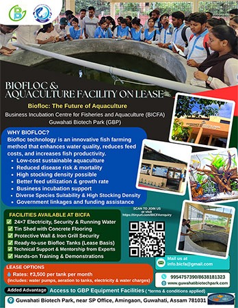 Business Incubation Centre for Fisheries and Aquaculture (BICFA), FIRST OF ITS KIND INITIATIVE UNDERTAKEN UNDER PMMSY IN NER, a pioneering venture by Guwahati Biotech Park (GBP), marking a first in Northeast Region (NER) of India supported by the Pradhan MantriMatsyaSampadaYojana (PMMSY). This initiative aims to prompt growth in entrepreneurship in the Fisheries and Aquaculture sector, specifically targeting the upliftment of entrepreneurship sector of NER.
